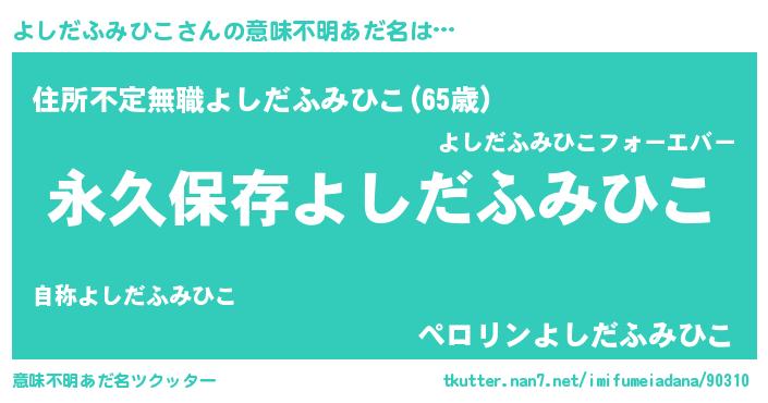 | ヘコむあだ名 | 『よしだふみひこ(笑)』『よしもー』 |
