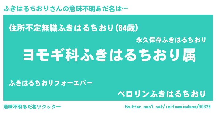 | 男性向けラノベタイトル風あだ名 | 『ふきはるちおり~年齢イコール彼女いない歴の魔法使い~』 |