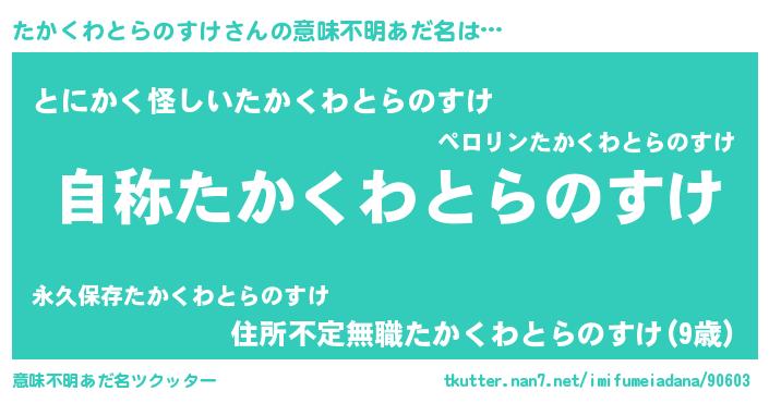 | 男性向けラノベタイトル風あだ名 | 『Re:たかくわとらのすけから始める異世界生活』 |