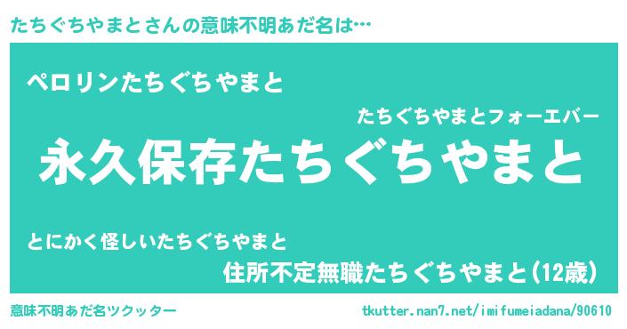 | 女子向けラノベタイトル風あだ名 | 『異世界で失敗しない100のたちぐちやまと』 |