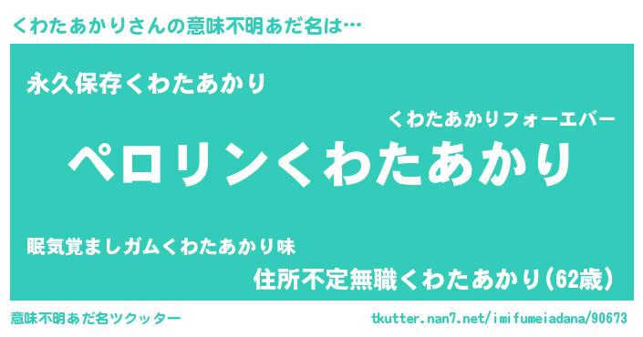 | 胡散臭い通販商品みたいなあだ名 | 『億万長者になれるブレスレット…その名も「くわたあかり」』 |