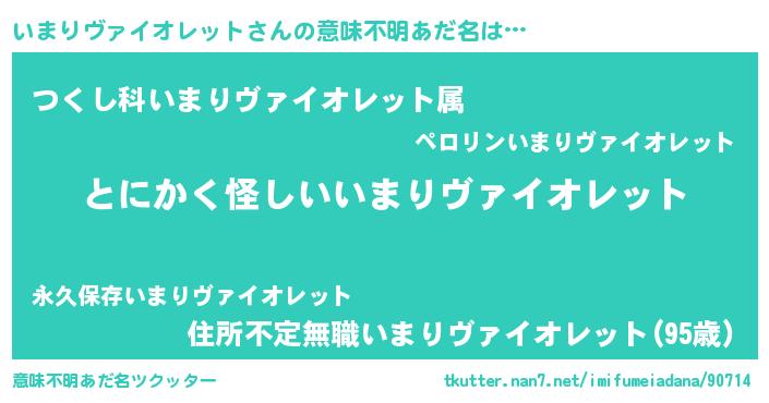 | 男性向けラノベタイトル風あだ名 | 『いまりヴァイオレットの嫁は女の子じゃないと思った?』 |