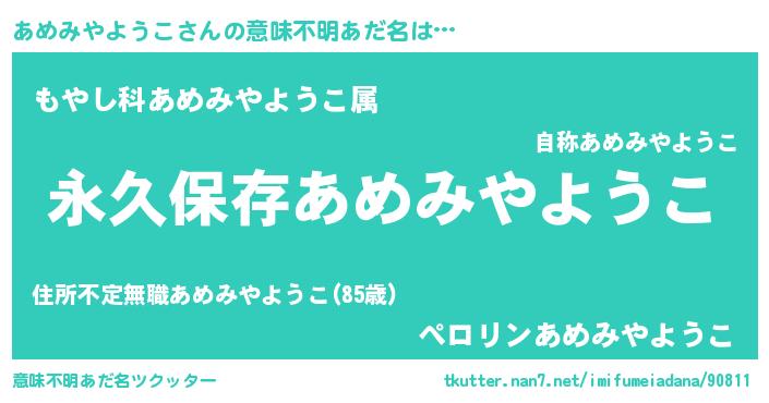 | 男性向けラノベタイトル風あだ名 | 『あめみやようこという概念が存在しない退屈な世界 』 |
