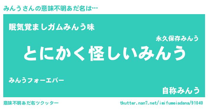 | 女子向けラノベタイトル風あだ名 | 『みんうの卵を拾いまして』 |