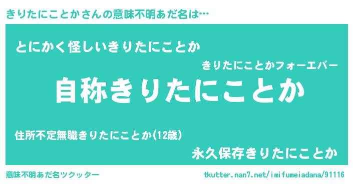 | 男性向けラノベタイトル風あだ名 | 『Re:きりたにことかから始める異世界生活』 |