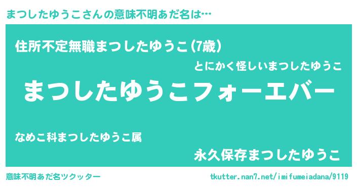 | 男性向けラノベタイトル風あだ名 | 『うちの娘の為ならば、俺はもしかしたらまつしたゆうこも倒せるかもしれない。』 |
