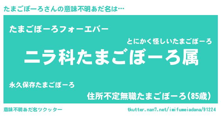 | 男性向けラノベタイトル風あだ名 | 『たまごぼーろ~年齢イコール彼女いない歴の魔法使い~』 |