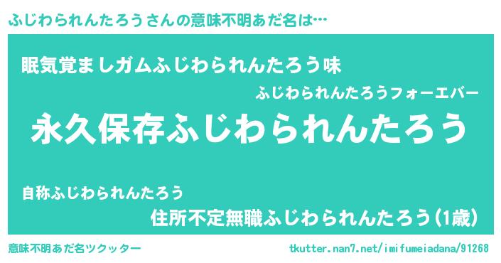 | 女子向けラノベタイトル風あだ名 | 『異世界で失敗しない100のふじわられんたろう』 |