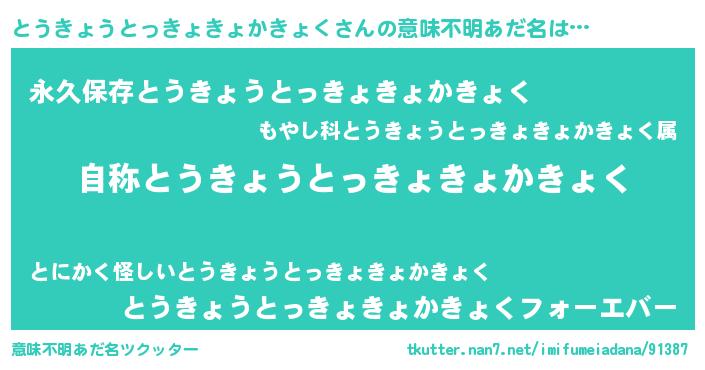 | 女子向けラノベタイトル風あだ名 | 『とうきょうとっきょきょかきょくなんてお断りですっ。』 |