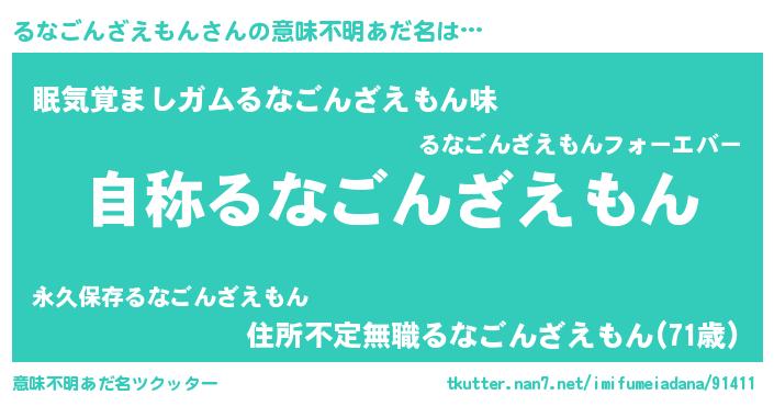 | 男性向けラノベタイトル風あだ名 | 『Re:るなごんざえもんから始める異世界生活』 |