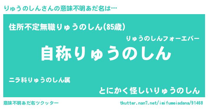 | 男性向けラノベタイトル風あだ名 | 『Re:りゅうのしんから始める異世界生活』 |