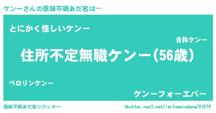 | 男性向けラノベタイトル風あだ名 | 『ケンーに滅ぼされるだけの簡単なお仕事です』 |
