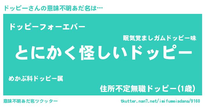 | 男性向けラノベタイトル風あだ名 | 『ドッピーの嫁は女の子じゃないと思った?』 |