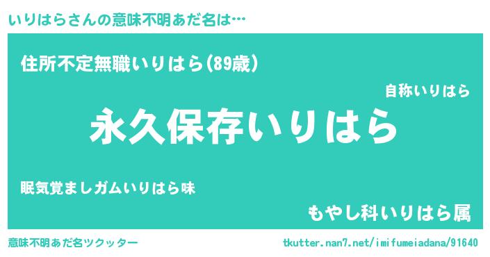 | 男性向けラノベタイトル風あだ名 | 『いりはらに滅ぼされるだけの簡単なお仕事です』 |