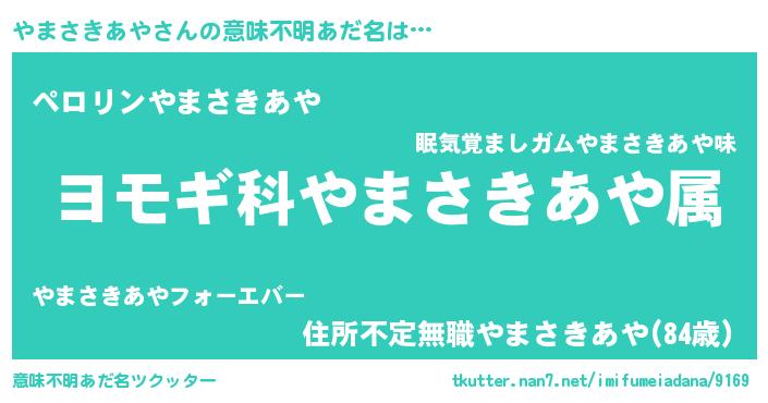 | 男性向けラノベタイトル風あだ名 | 『やまさきあや~年齢イコール彼女いない歴の魔法使い~』 |