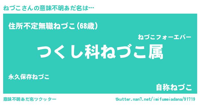 | 男性向けラノベタイトル風あだ名 | 『ねづこに滅ぼされるだけの簡単なお仕事です』 |