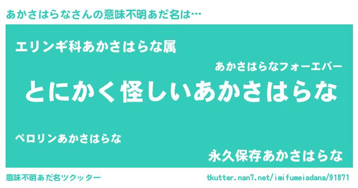 | 男性向けラノベタイトル風あだ名 | 『あかさはらなの嫁は女の子じゃないと思った?』 |