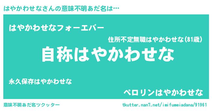| 欧米人風あだ名 | 『はやかわせな・ステッグマイヤー』 |