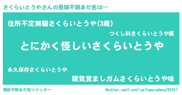 | 女子向けラノベタイトル風あだ名 | 『さくらいとうやの卵を拾いまして』 |