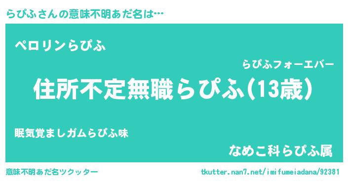| 欧米人風あだ名 | 『アンジェラ・らぴふ』『マイケルらぴふ』 |