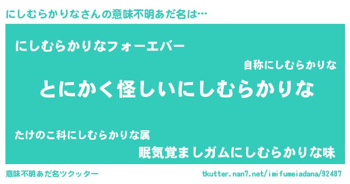 | 男性向けラノベタイトル風あだ名 | 『にしむらかりなの嫁は女の子じゃないと思った?』 |