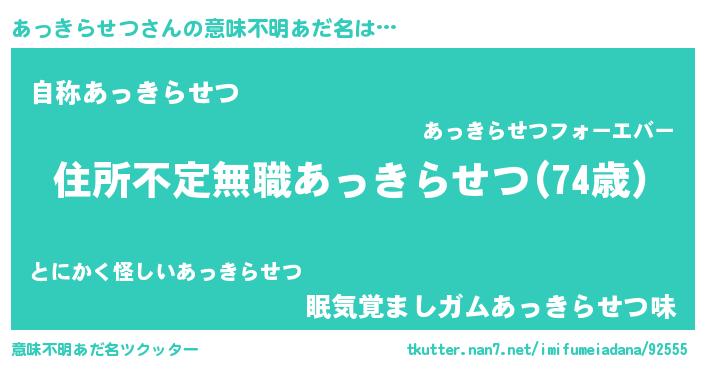 | 女子向けラノベタイトル風あだ名 | 『あっきらせつが死なない童話 林檎のあっきらせつの診療簿』 |