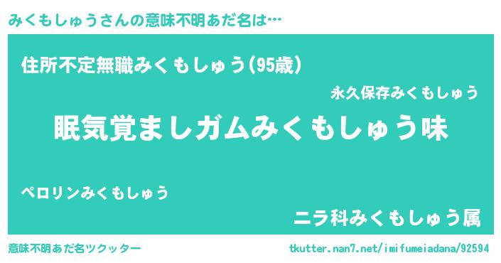 | ヘコむあだ名 | 『みくもしゅう(震え声)』『みくっふぃ~』 |
