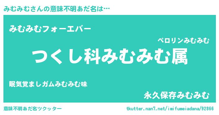 | 男性向けラノベタイトル風あだ名 | 『みむみむ~年齢イコール彼女いない歴の魔法使い~』 |