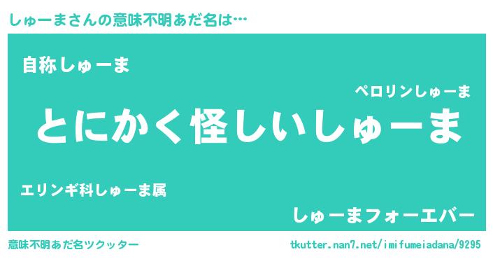 | 男性向けラノベタイトル風あだ名 | 『しゅーまの嫁は女の子じゃないと思った?』 |