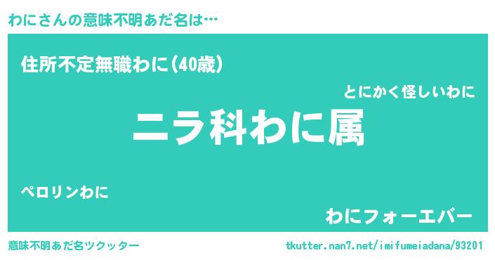 | 男性向けラノベタイトル風あだ名 | 『わに~年齢イコール彼女いない歴の魔法使い~』 |