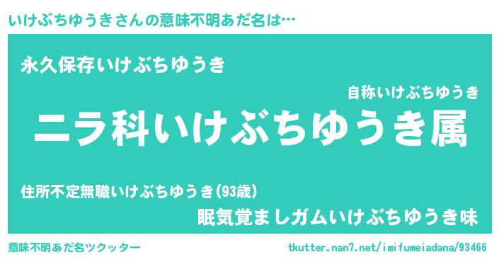 | 男性向けラノベタイトル風あだ名 | 『いけぶちゆうき~年齢イコール彼女いない歴の魔法使い~』 |