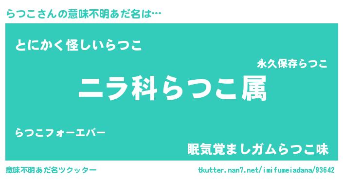| 男性向けラノベタイトル風あだ名 | 『うちのらつこが世界を掌握している!』 |