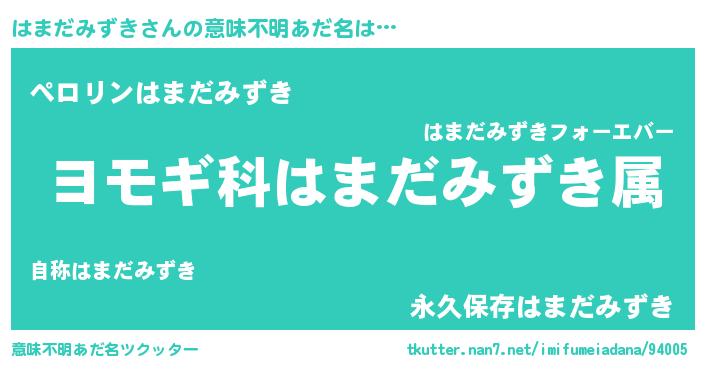 | 男性向けラノベタイトル風あだ名 | 『はまだみずき~年齢イコール彼女いない歴の魔法使い~』 |