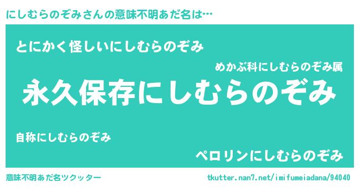 | ヘコむあだ名 | 『にしむらのぞみ(小並感)』『にしっちょ』 |