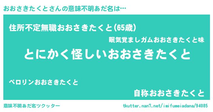 | 女子向けラノベタイトル風あだ名 | 『おおさきたくとは平凡を望む』 |