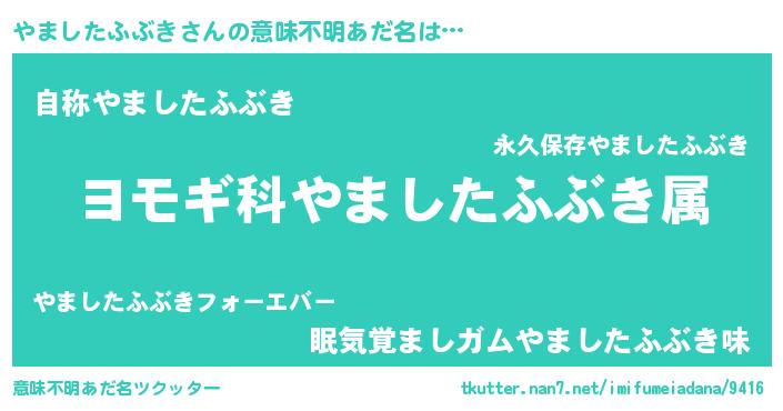 | 男性向けラノベタイトル風あだ名 | 『やましたふぶき~年齢イコール彼女いない歴の魔法使い~』 |