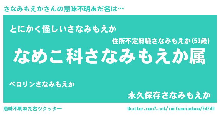 | 男性向けラノベタイトル風あだ名 | 『転生したらさなみもえかだった件』 |