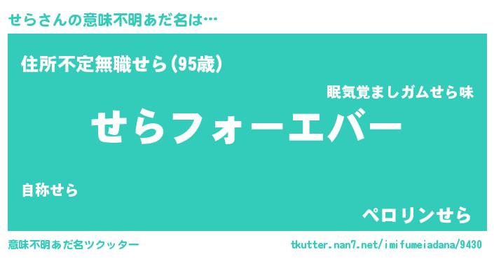 | 女子向けラノベタイトル風あだ名 | 『せらの雑貨屋さん』『死神せらの再婚』 |