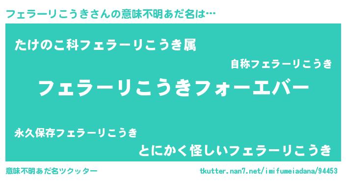 | 女子向けラノベタイトル風あだ名 | 『フェラーリこうきの雑貨屋さん』 |