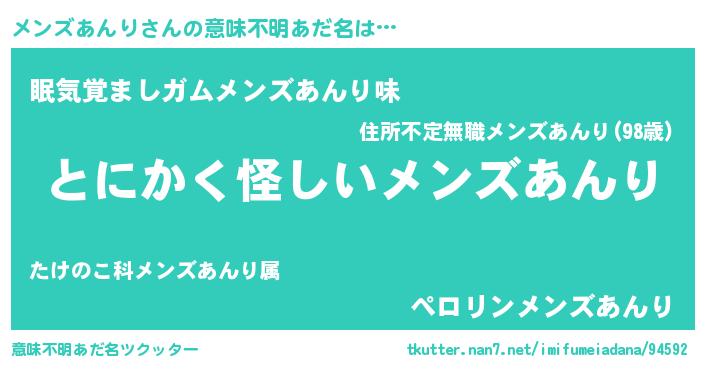 | 女子向けラノベタイトル風あだ名 | 『メンズあんりの卵を拾いまして』 |