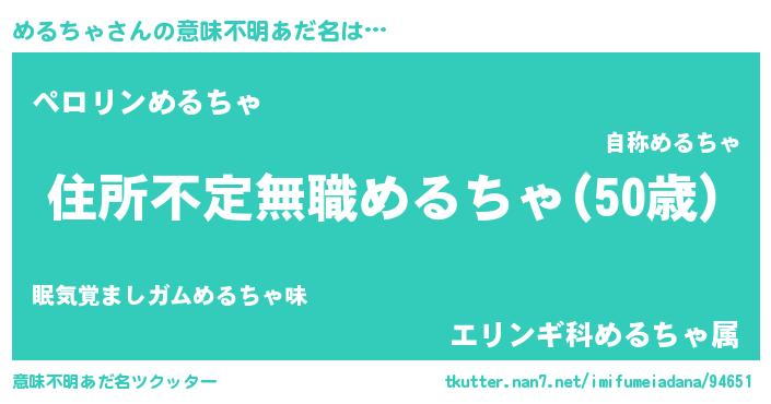 | 男性向けラノベタイトル風あだ名 | 『魔弾の王とめるちゃ』『めるちゃの憂鬱』 |
