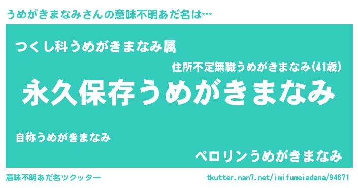 | 胡散臭い通販商品みたいなあだ名 | 『来世でも幸せになれる水素水…その名も「うめがきまなみ」』 |