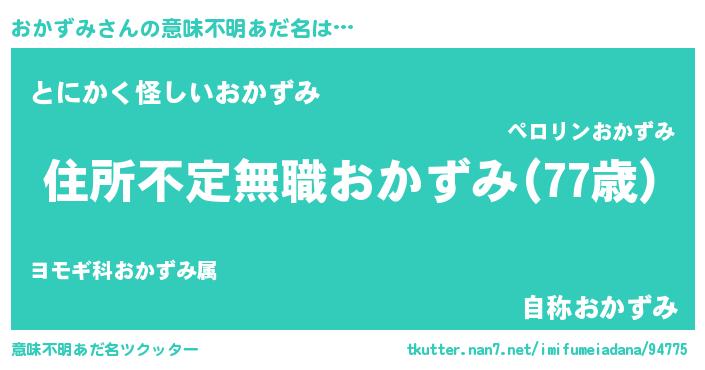 | 男性向けラノベタイトル風あだ名 | 『魔弾の王とおかずみ』『おかずみの憂鬱』 |