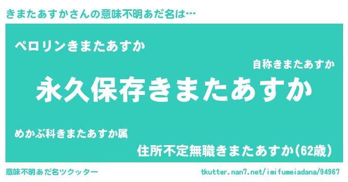| 男性向けラノベタイトル風あだ名 | 『きまたあすかという概念が存在しない退屈な世界 』 |
