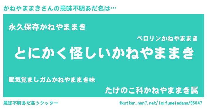 | 男性向けラノベタイトル風あだ名 | 『かねやままきの嫁は女の子じゃないと思った?』 |
