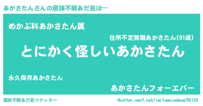 | 男性向けラノベタイトル風あだ名 | 『あかさたんの嫁は女の子じゃないと思った?』 |