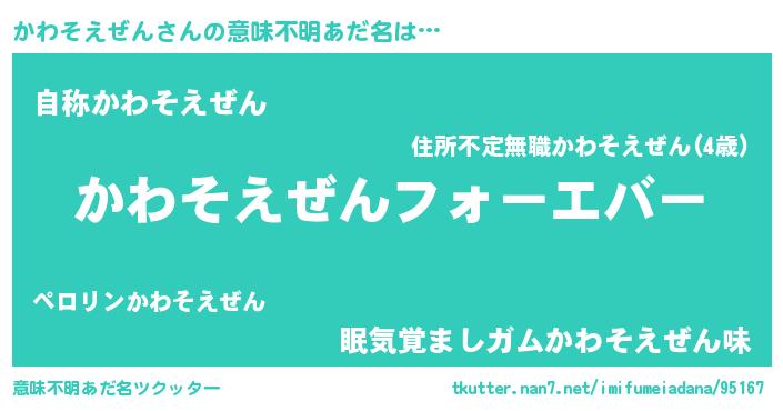 | 欧米人風あだ名 | 『かわそえぜんクリステル』 |