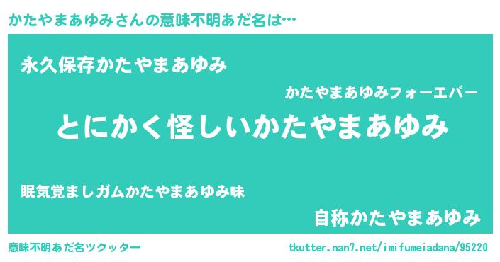 | 男性向けラノベタイトル風あだ名 | 『かたやまあゆみの嫁は女の子じゃないと思った?』 |
