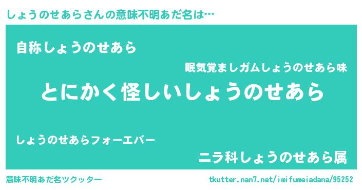 | 男性向けラノベタイトル風あだ名 | 『しょうのせあらに滅ぼされるだけの簡単なお仕事です』 |
