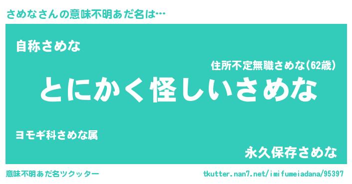 | 女子向けラノベタイトル風あだ名 | 『さめなは平凡を望む』 |